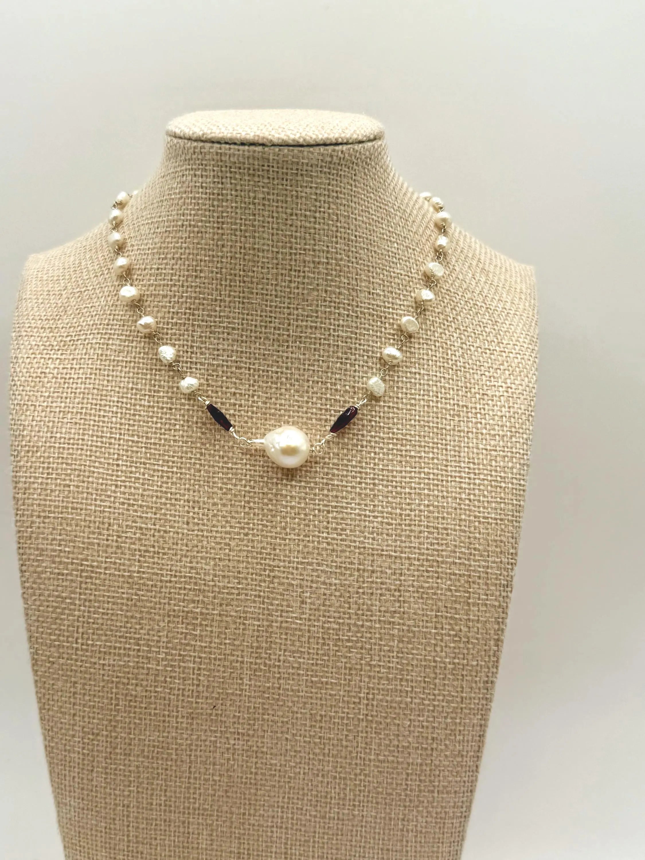 14" Choker with Freshwater pearls surounding a baroque pearl and two diamond shaped garnets.
