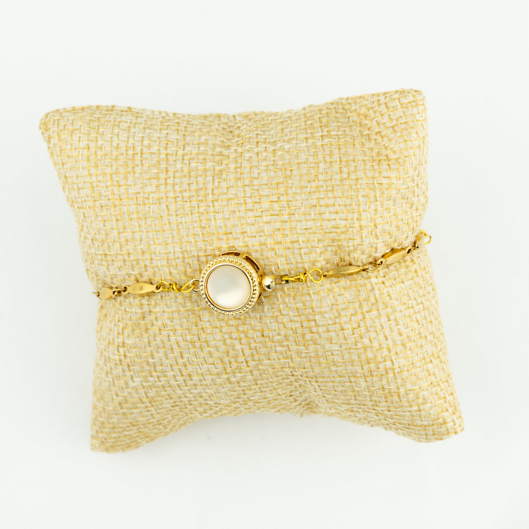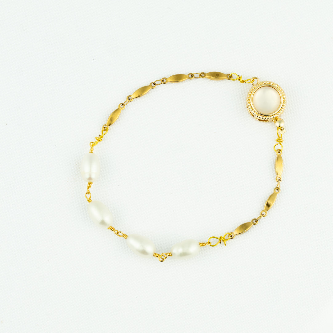 Simply beautiful is this gold freshwater pearl bracelet with a mother of pearl clasp.