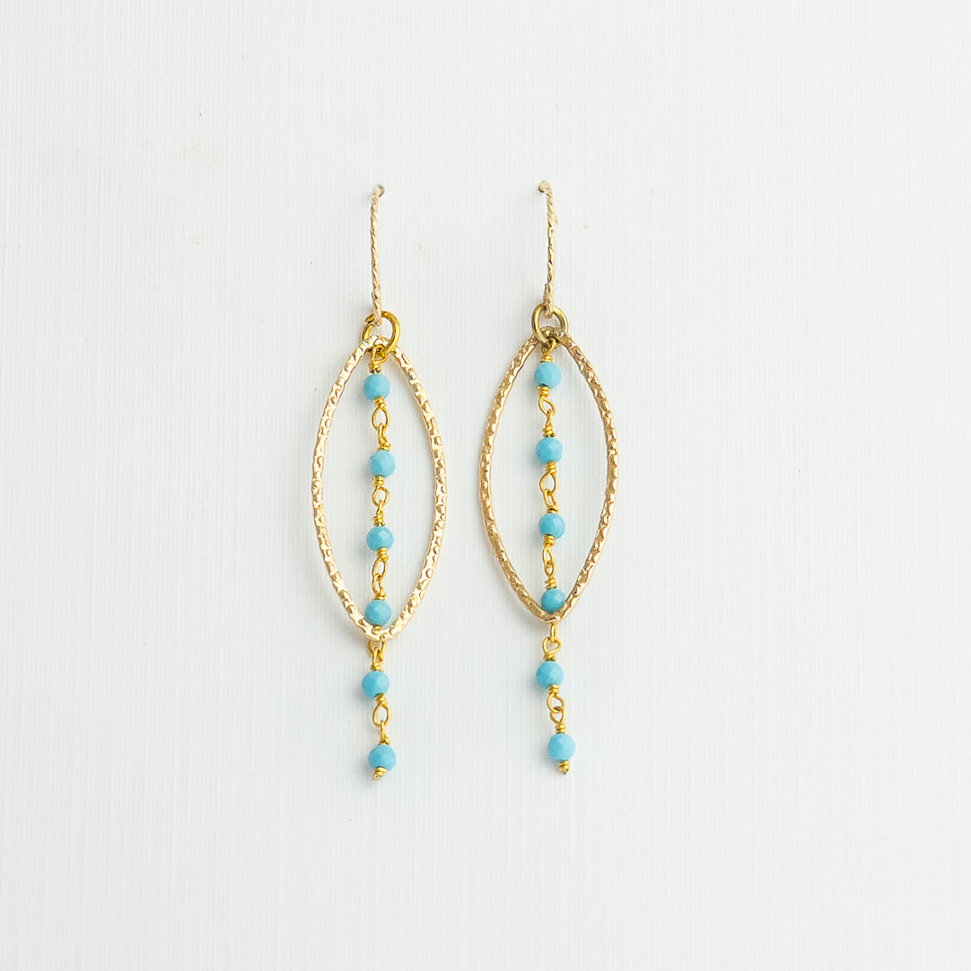 These lightweight boho-chic earrings are so very comfortable and easy to wear. These feature gold filled ear wire, gold filled marquise and 3mm turquoise.