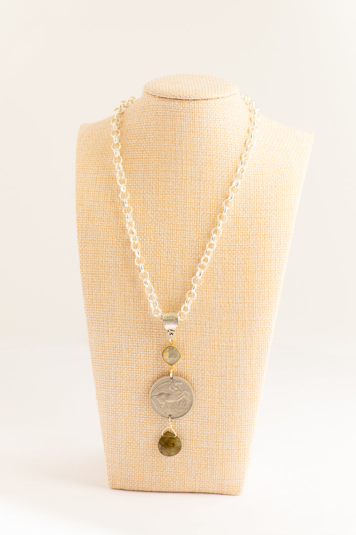 Matte Silver Rolo Necklace with Double Labradorite and Greek Drachma