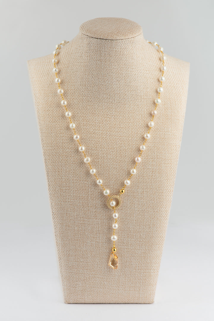 This stunning lariat is strung with 6mm freshwater pearls and features a matte gold toggle and a Swarovski crystal in golden shadow.