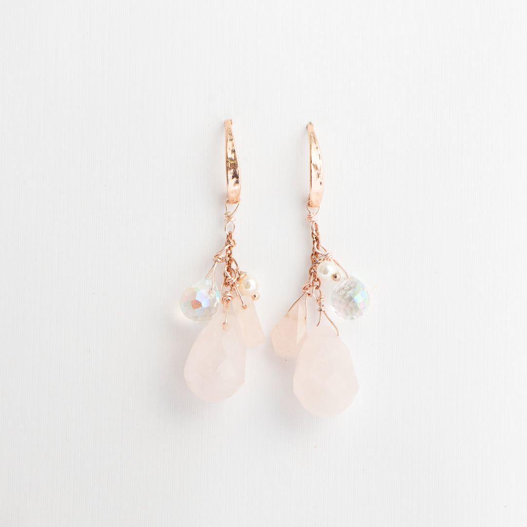 These stunning rose quartz earrings feature a center rose quartz dripping with pearls and faceted crystals and hang from hammered rose quartz hangers.