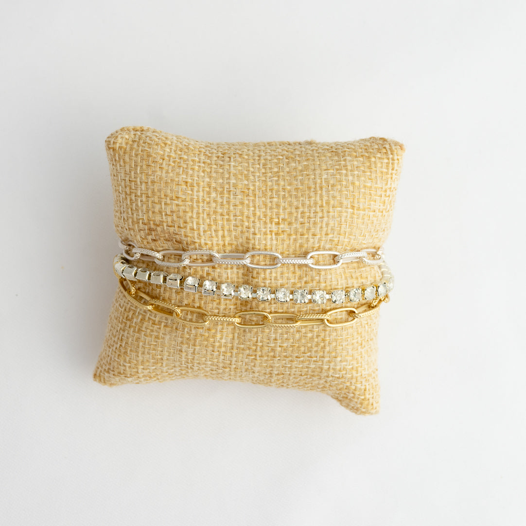 Triple Strand Mixed Metal and Rhinestone Bracelet
