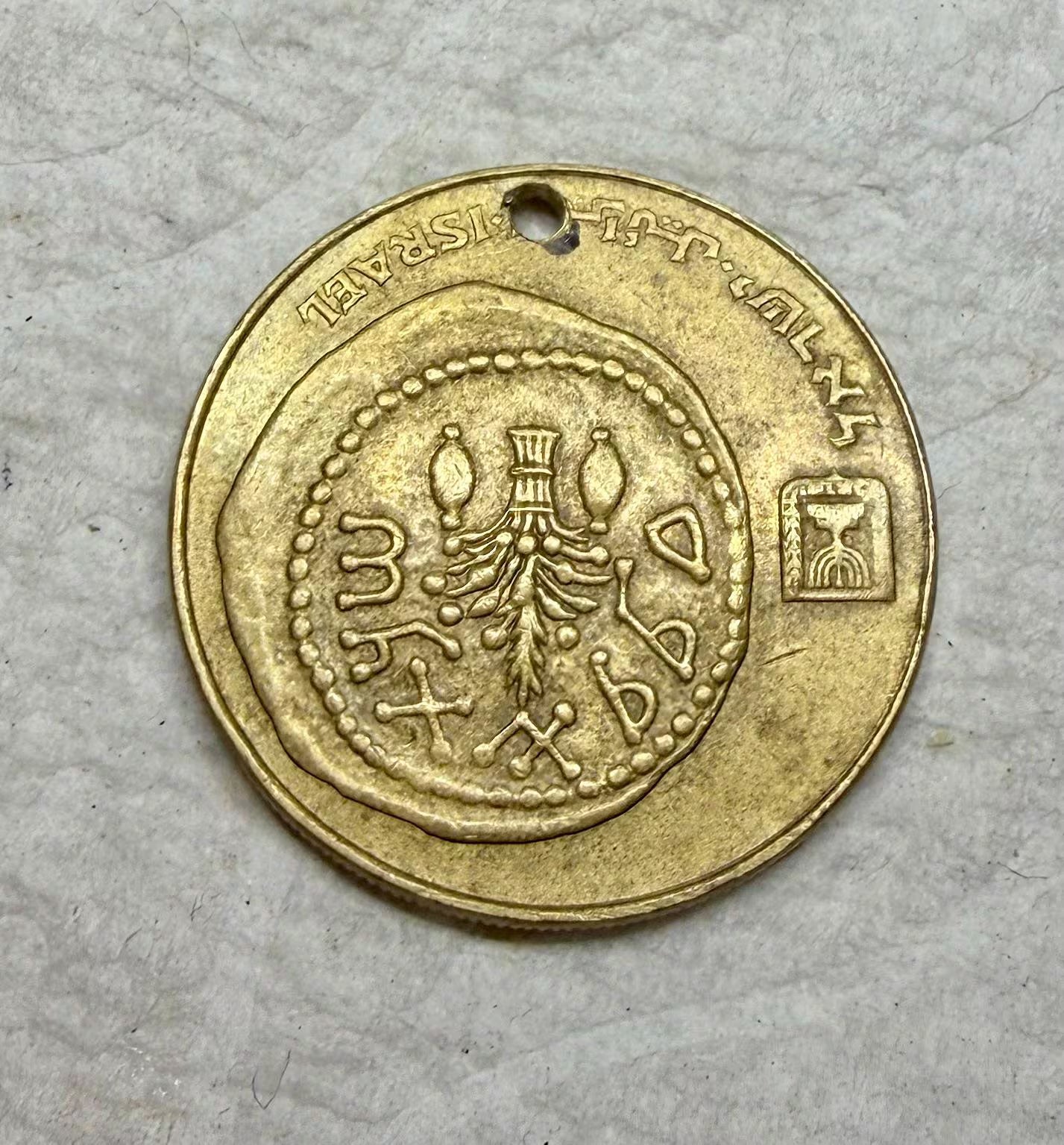 Double Chain 15" Necklace with GP Paperclip chain, pink freshwater pearls featuring an out-of-circulation Israeli coin.
